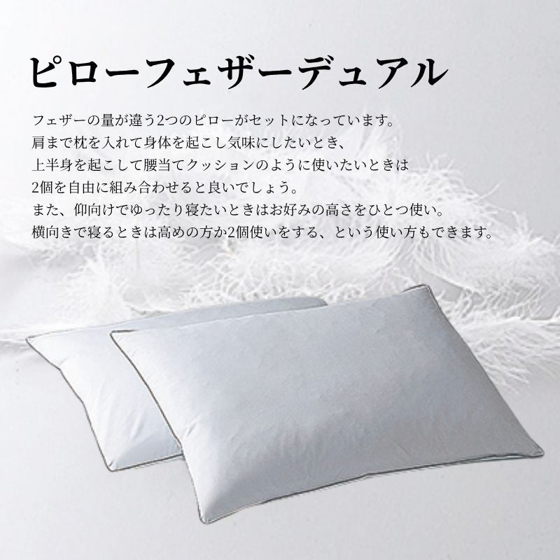 フェザーの量が違う2つのピローがセットになっています。一流ホテルで多く使われているスタイルで、使い分けによって高さの調節が可能です。