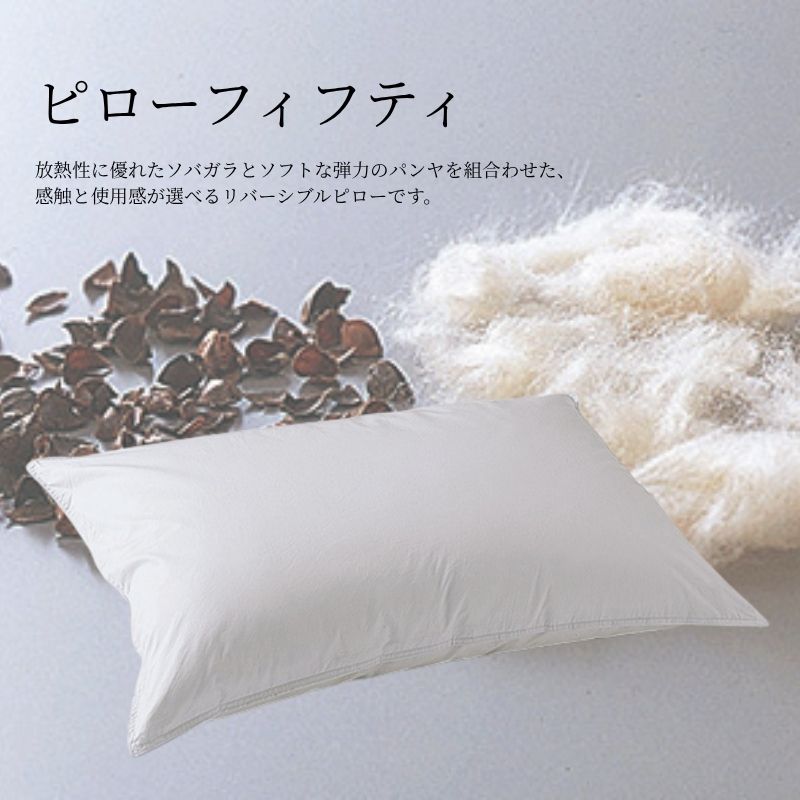 ◆ピローフィフティ放熱性に優れたソバガラとソフトな弾力のパンヤを組合わせたリバーシブルピローです。